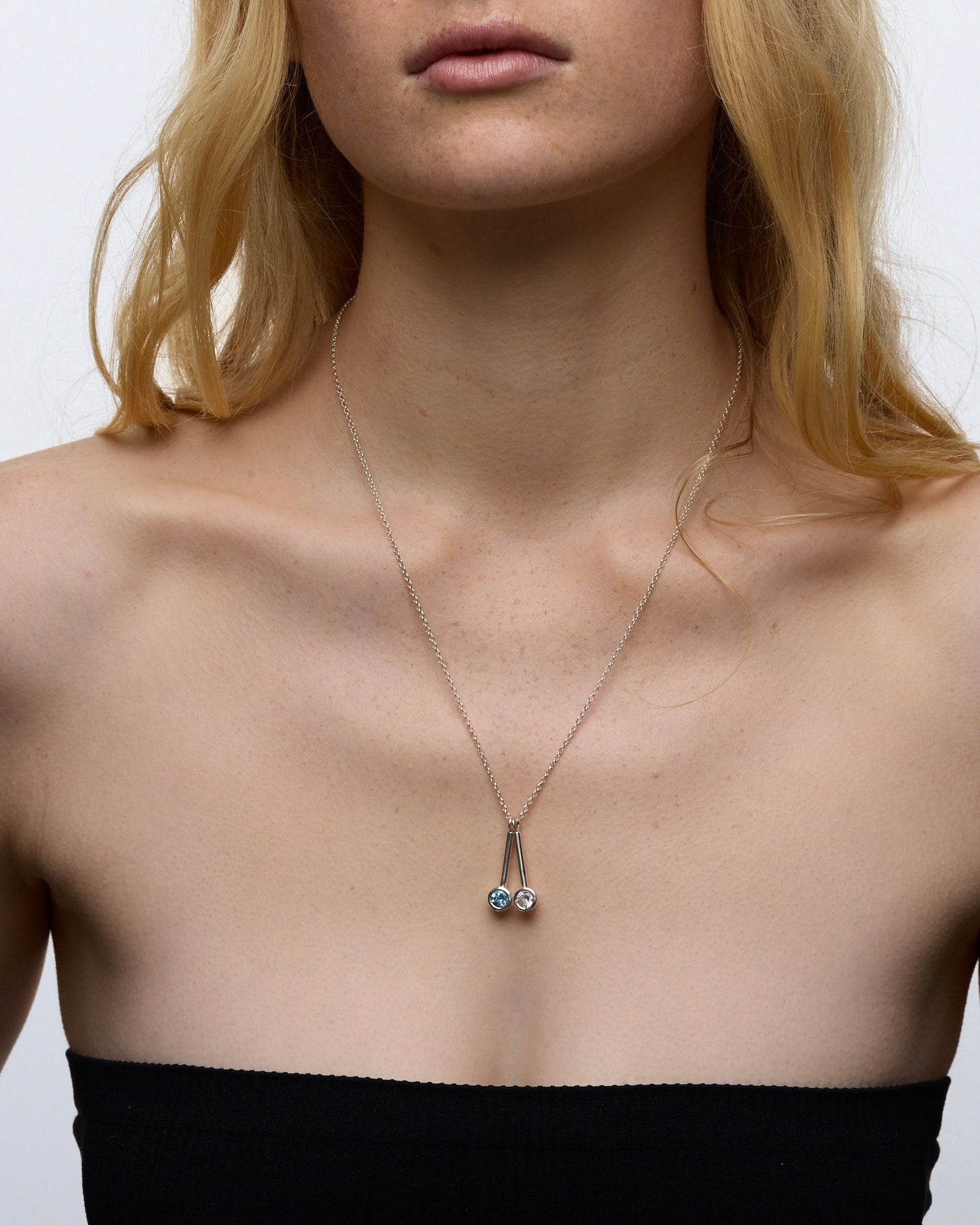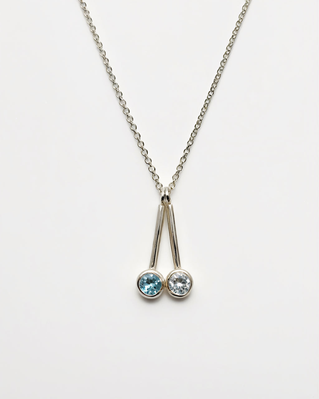 A pair of interchangeable solid sterling silver pendants on a a fine chain. Each pendant features a round faceted 6mm gemstone. A playful yet luxurious piece intended for everyday wear.