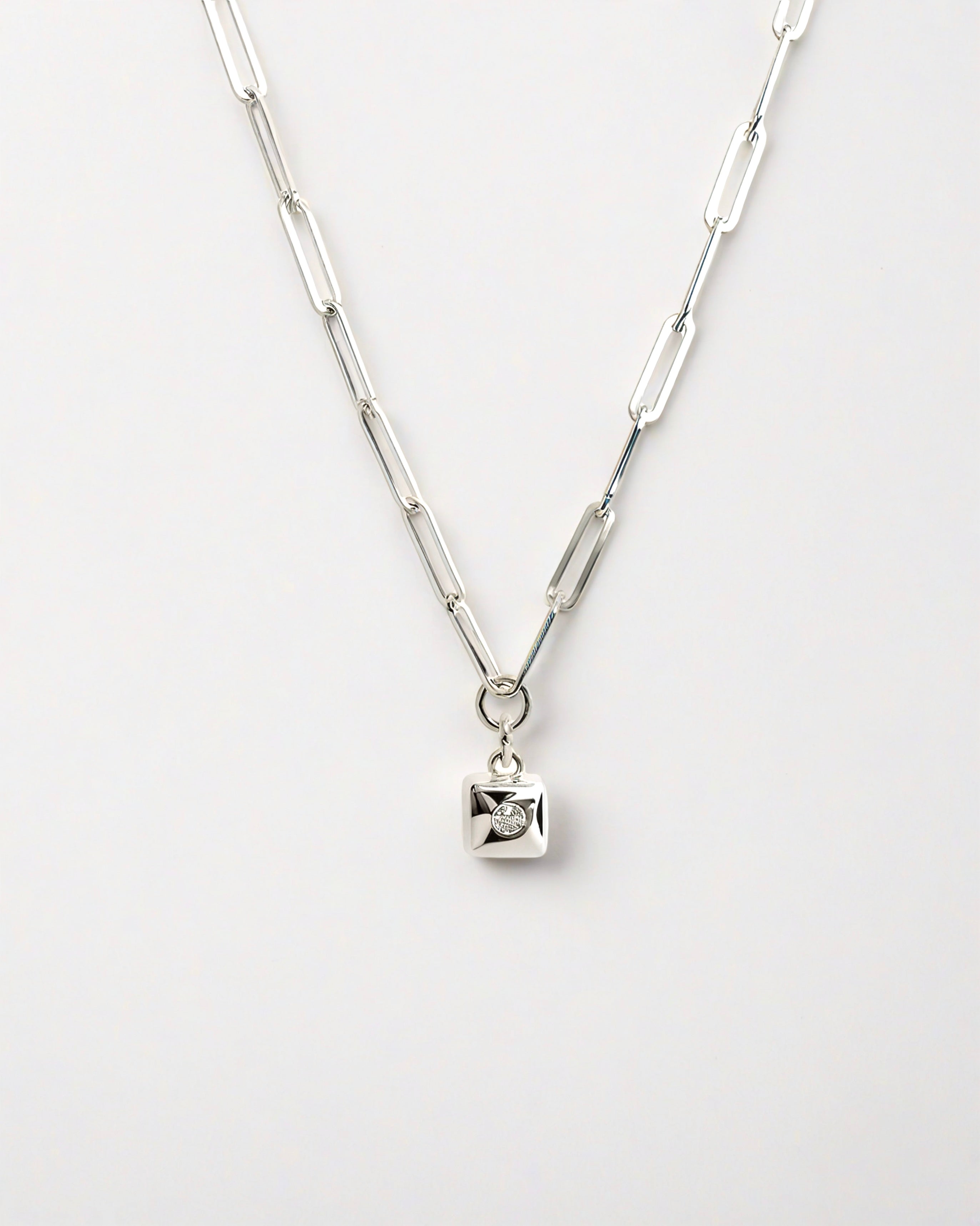 A sterling silver solid cube pendant set with a small white diamond on a light paperclip chain.