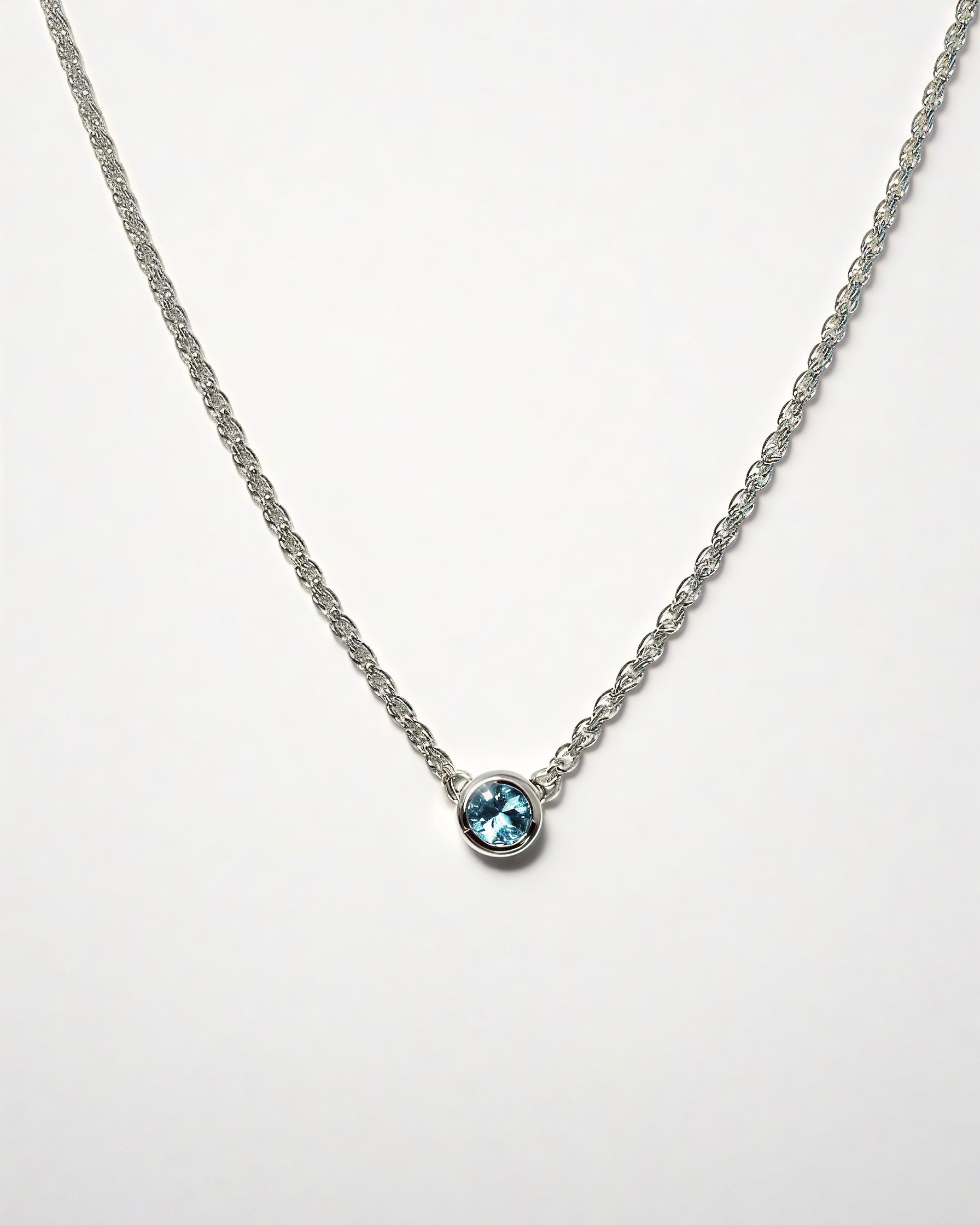 A solid sterling silver necklace featuring a 6mm Sky Blue Topaz on a medium weight chain.